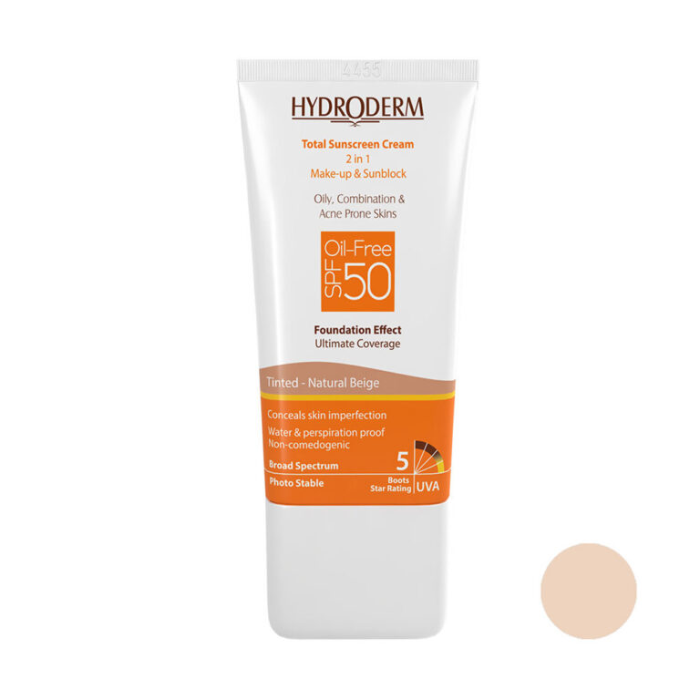کرم ضد آفتاب SPF50 فاقد چربی با پوشش کرم پودری بژ طبیعی هیدرودرم hydroderm